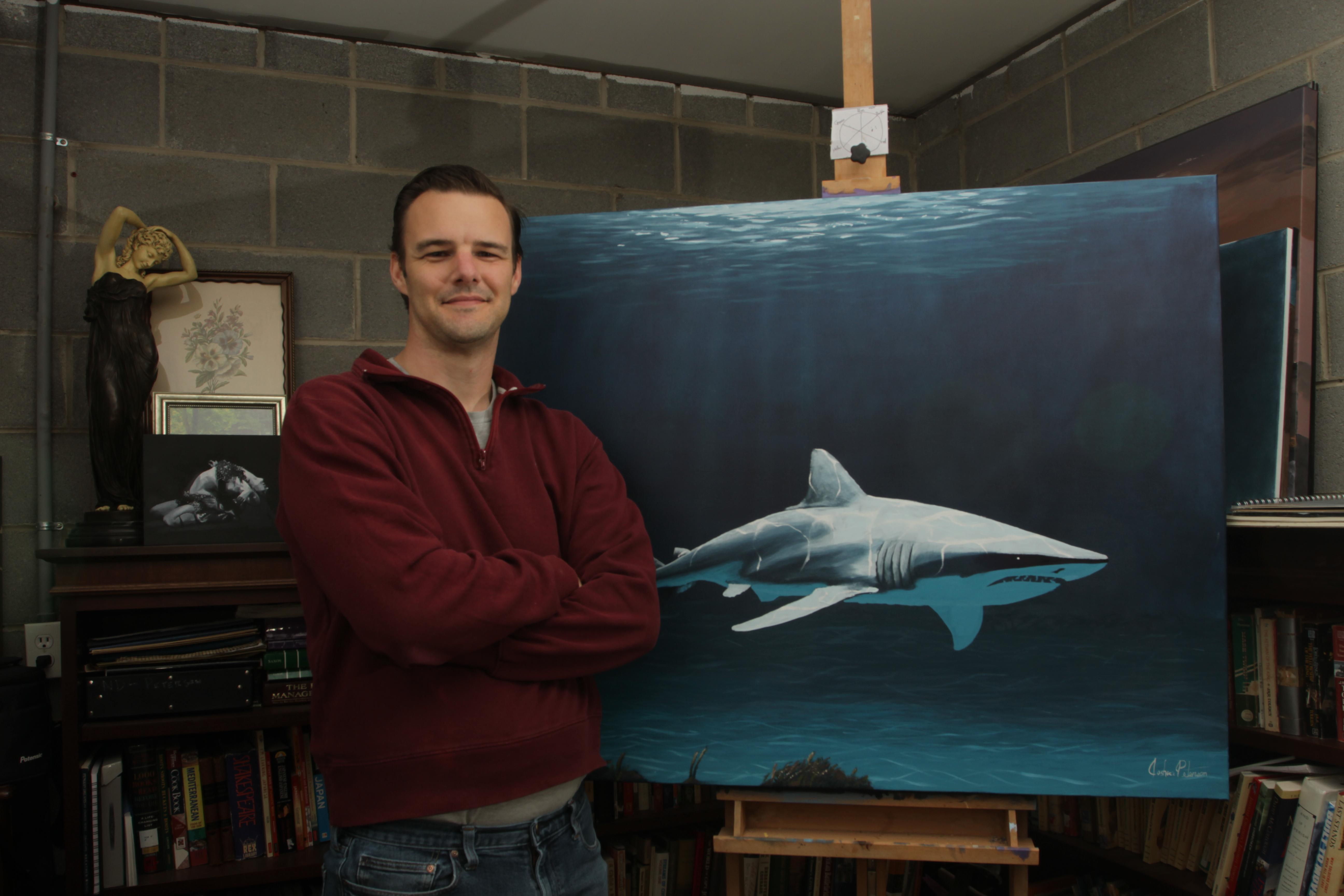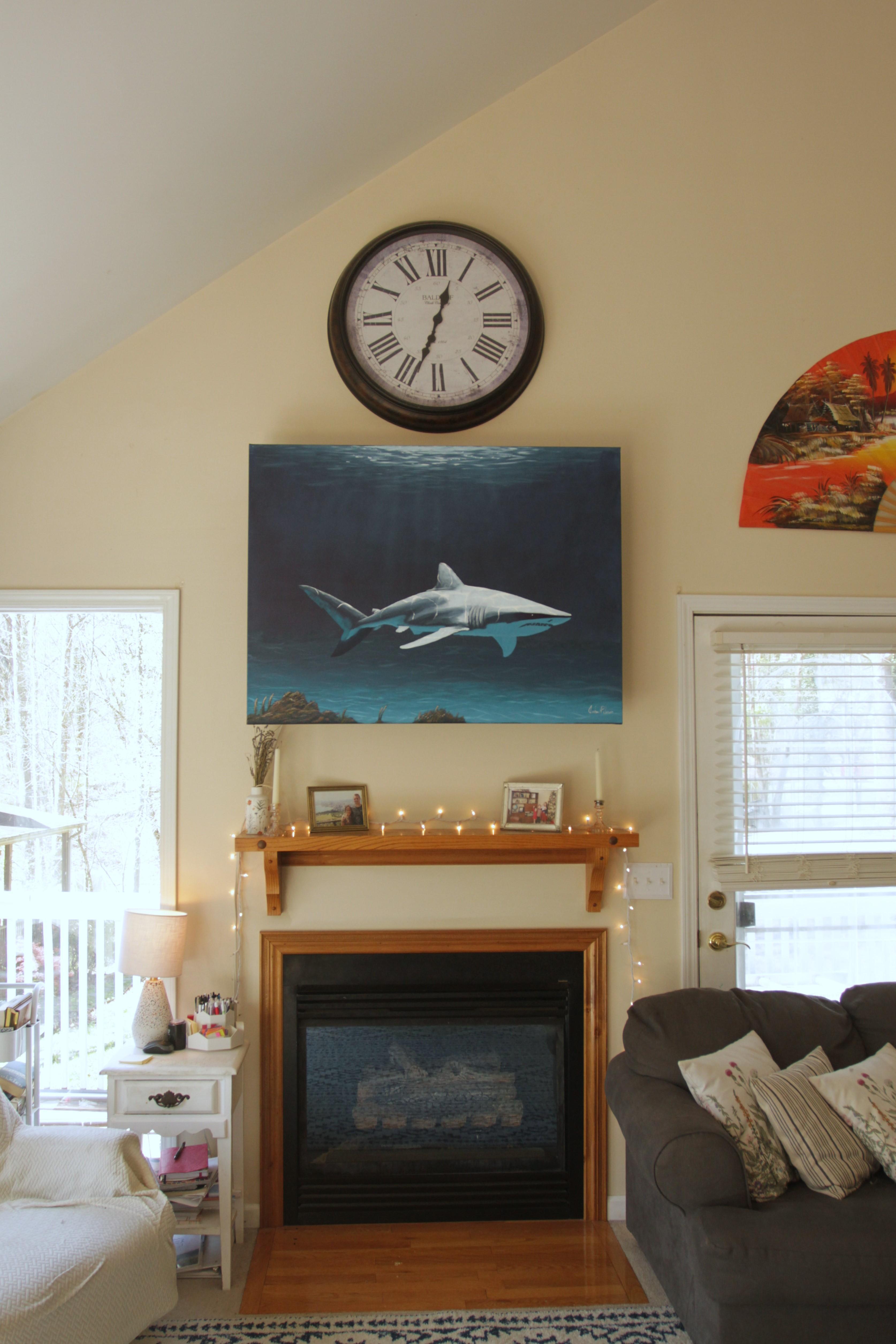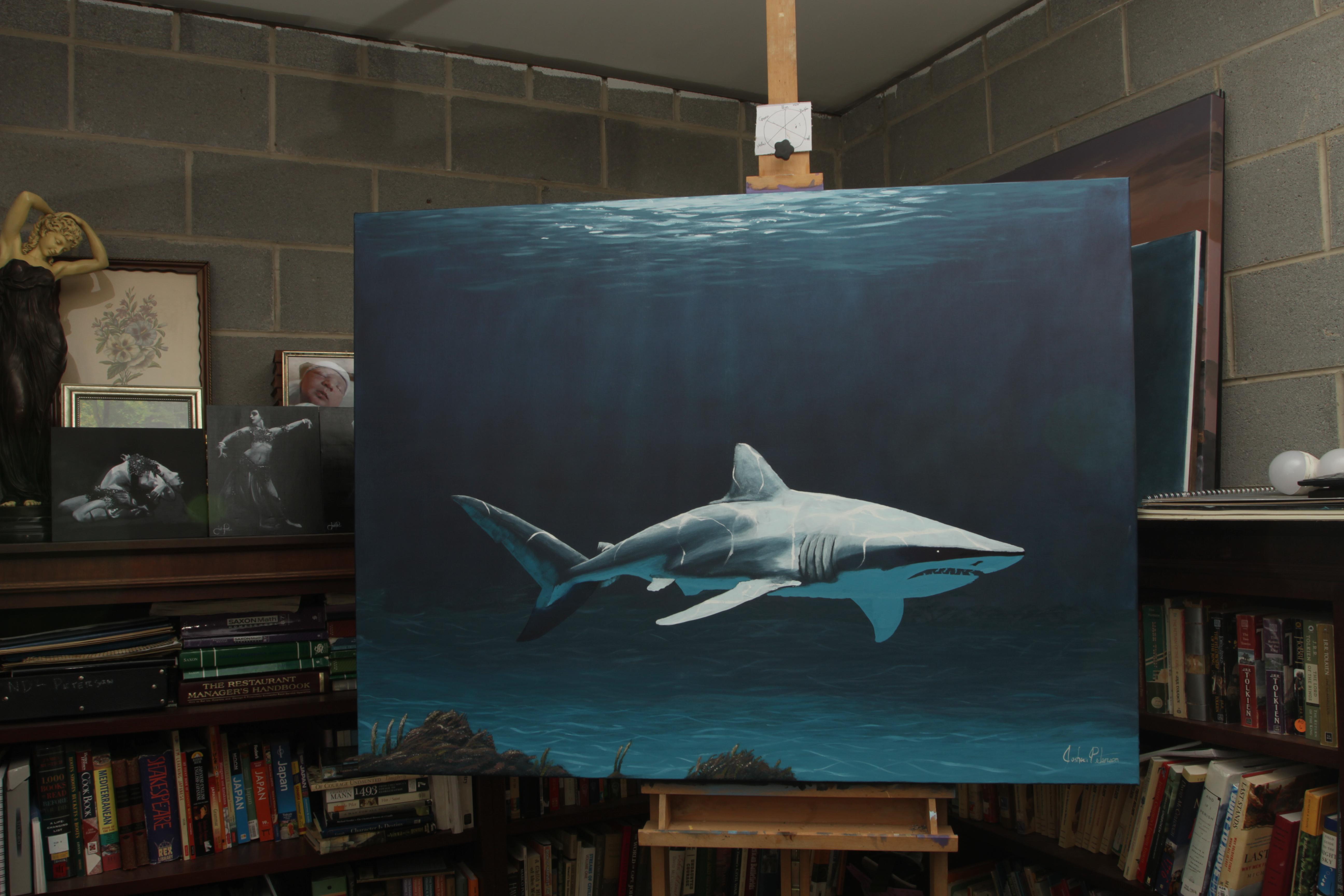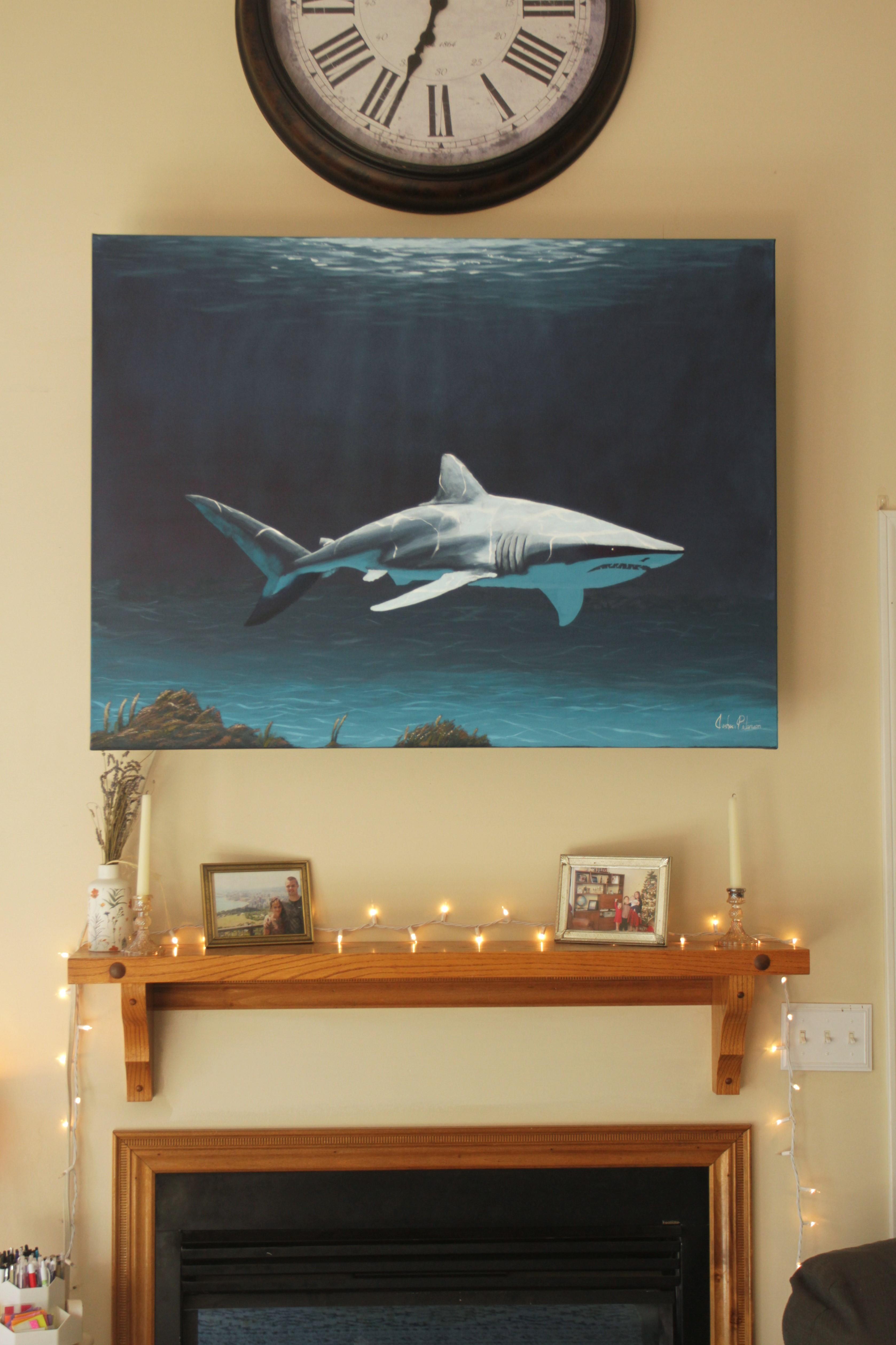 This is one of my favorite pieces. I love the light-dark contrast, and in a low light setting it absolutely looks like the the shark is coming out of the painting. This painting reminds me so much of the night time dives I used to do in Hawaii.